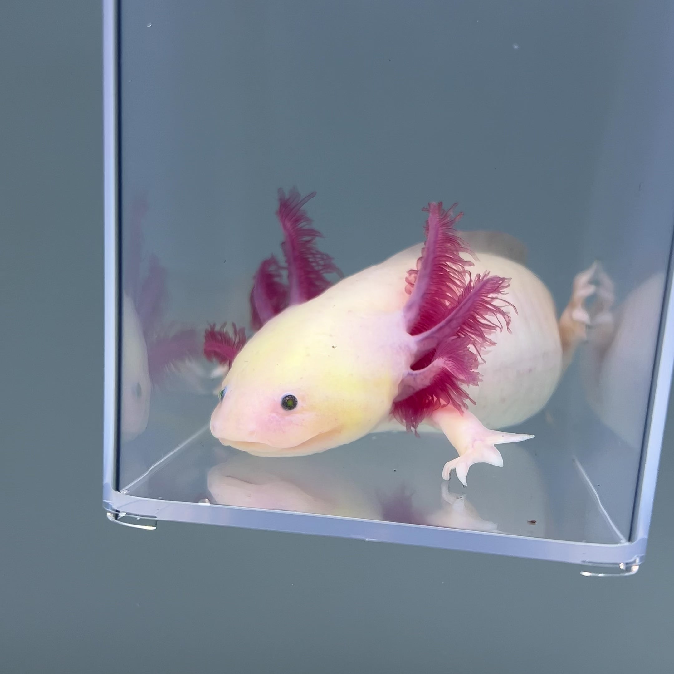 Luna is a GFP Leucistic Axolotl! While not being a rare morph, she is one of the most beautiful axolotls we have ever seen in terms of physical quality. She has extra long, fluffy gills, massive fins, and very robust in overall size. In other words, Luna is a unit 🤌🏼
