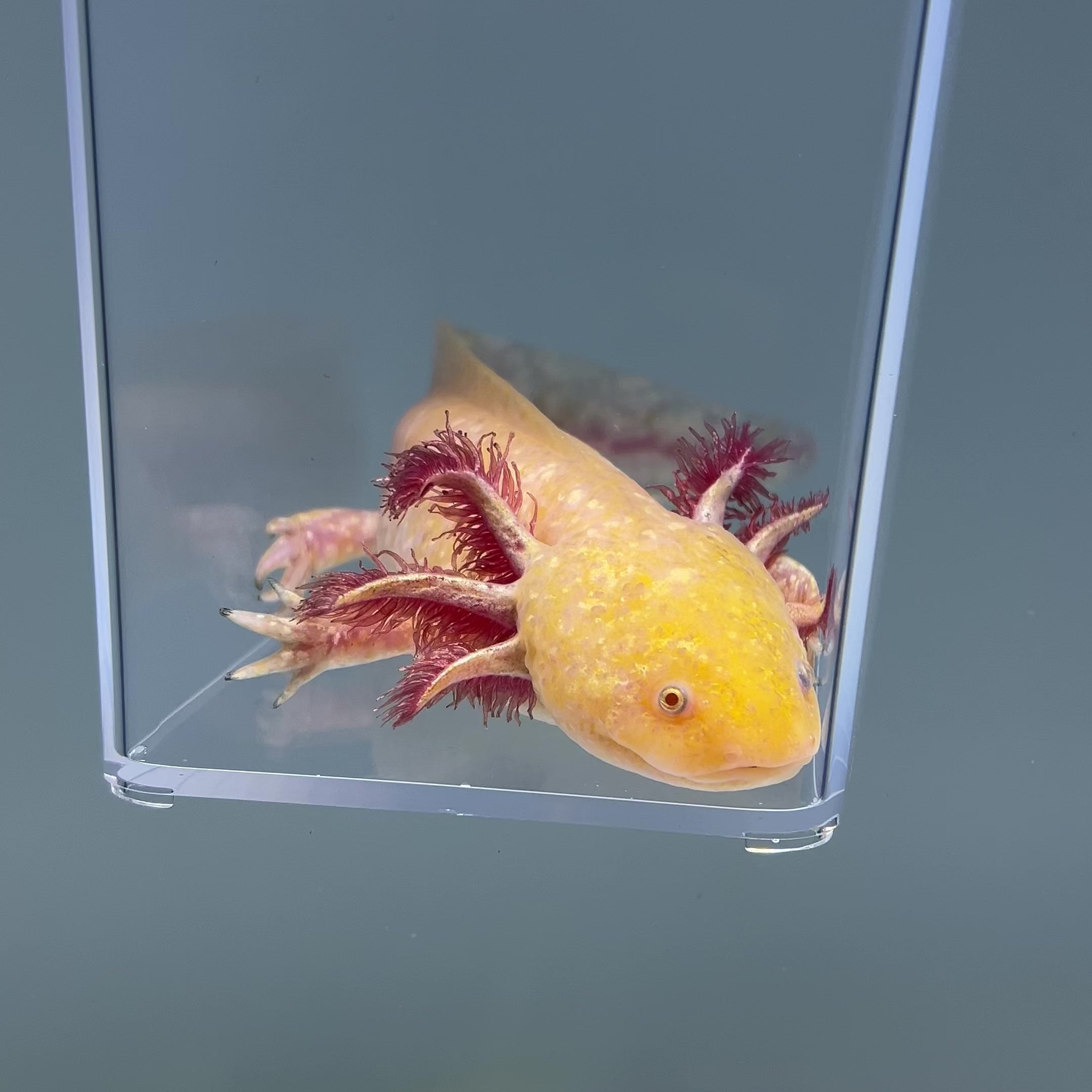 Midas is a rare Hypomelanistic Copper Axolotl! Because of the hypomelanistic gene, he lacks a significant amount of dark pigmentation, revealing the beautiful yellow/gold contrast that you don't normally see in Copper Axolotls!